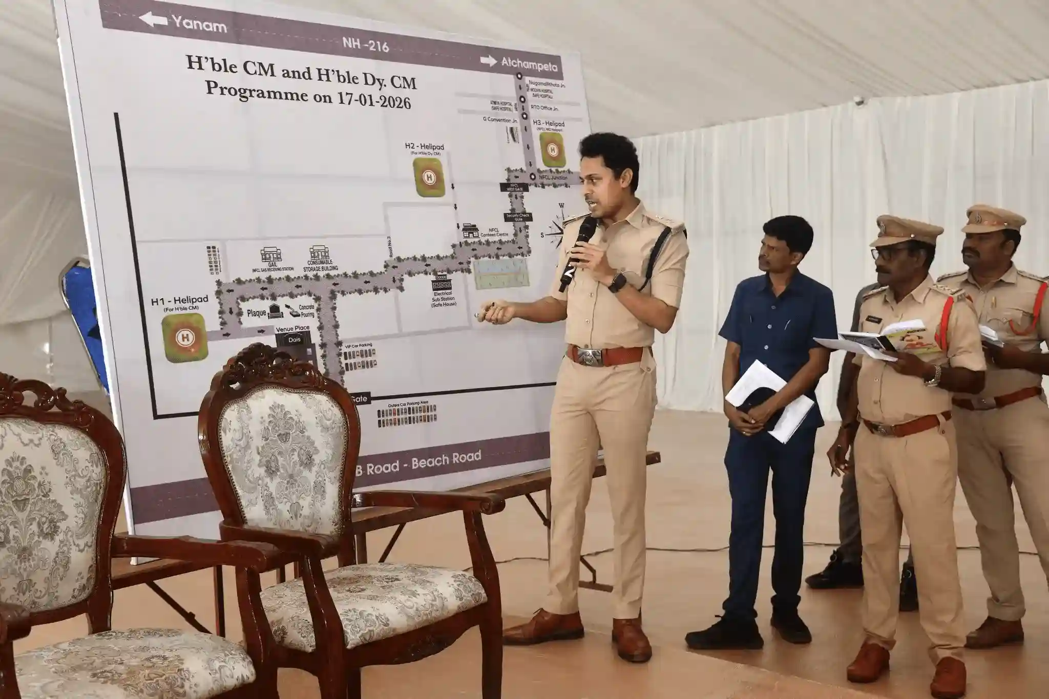 Kakinada, Andhra Pradesh: In view of the proposed visit of the Hon’ble Chief Minister of Andhra Pradesh, Sri Nara Chandrababu Naidu, and the Hon’ble Deputy Chief Minister, Sri Konidala Pawan Kalyan, to the program scheduled to be held at the National Fertilizers Limited (NFCL) premises in Kakinada on 17-01-2026, comprehensive security and bandobast arrangements are being put in place by the Kakinada District Police.